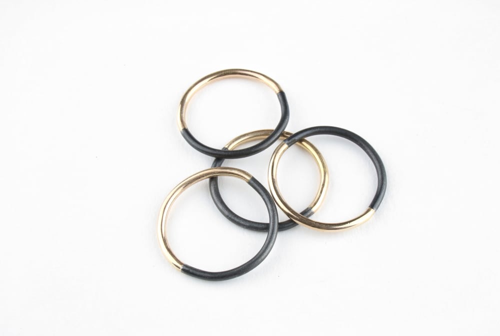 Gold and black steel come together in these married metal rings. Show both of your sides and stack a few together for the best contrast. Select a US ring size from 5-12.
